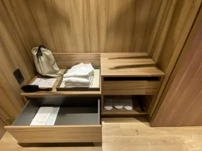 引き出しの中には緑茶、janatの紅茶、カルディのオーガニックコーヒー、デカフェのインスタントコーヒーなどが収納されています。ラインナップにホテルのこだわりを感じます!
