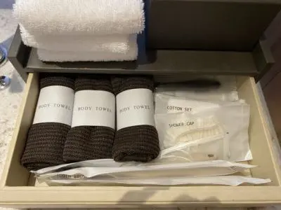 ボディタオル、シャワーキャップ、歯ブラシ、コットン、爪磨きなどのアメニティは十分な品ぞろえです。