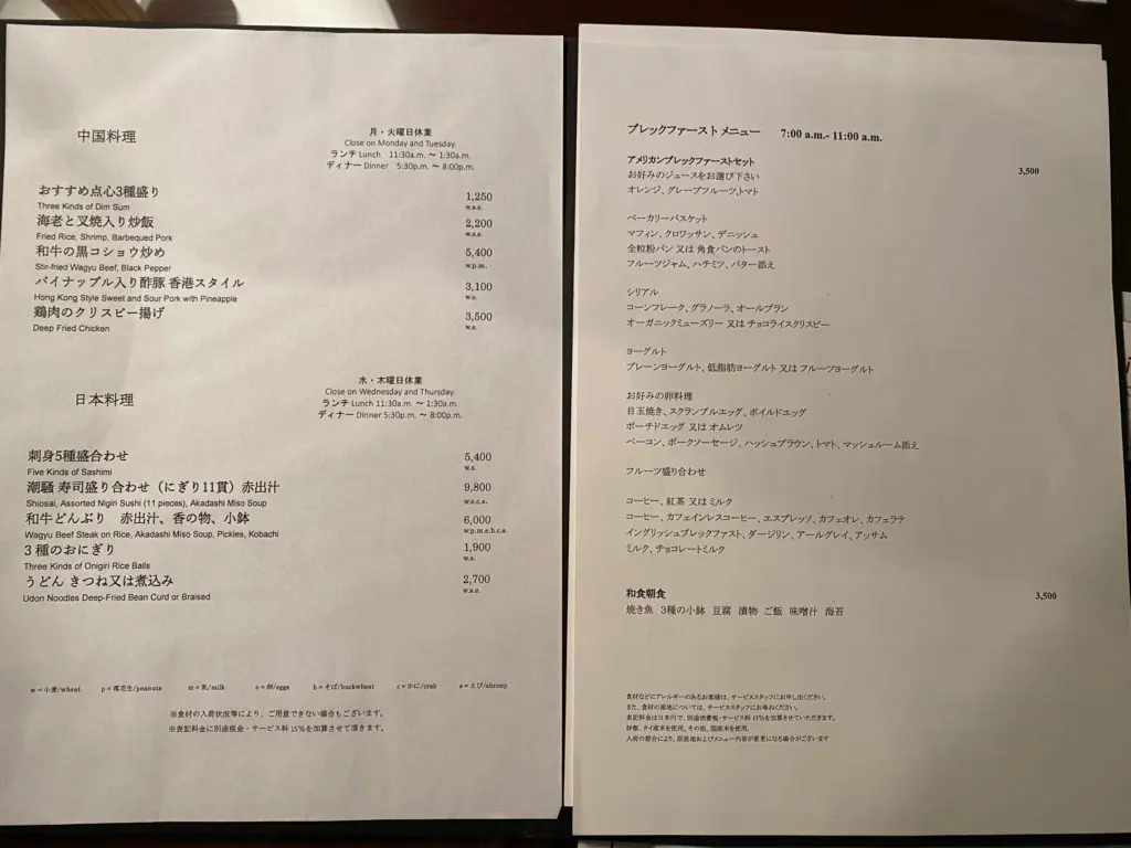 ちょっと見づらいかもしれませんが、ご参考までにルームサービスのメニューの一部です。お部屋でのブレックファーストもいいなあ…!