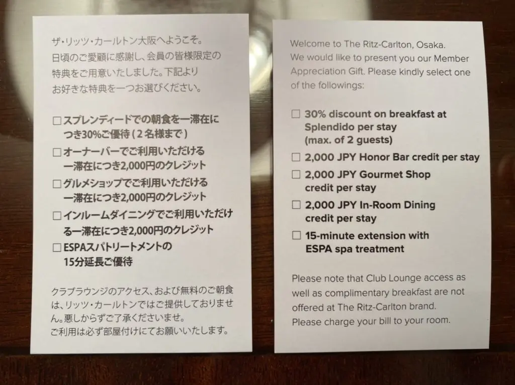 そしてさらなるゴールド会員の特典が♪以下の5つの中から1つ選べます。基本的にはチェックイン時に選ぶ形となります。