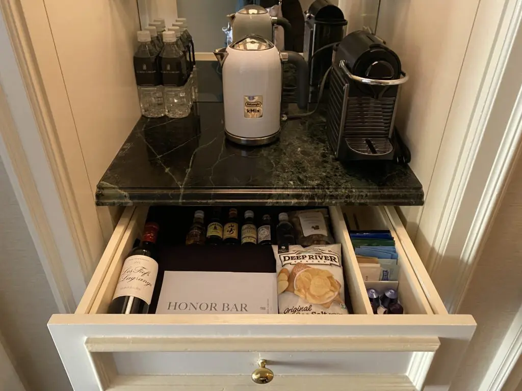 無料のミネラルウォーターが4本もあります。ネスプレッソが置いてあると高級ホテルだなと感じます。笑。コーヒーカプセルは全部で6個あり、ターンダウンサービスの時も補充してくれるのでありがたいです。アルコールやポテチはもちろん有料です。