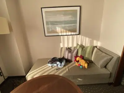 ここでも寝られるんじゃないかというくらいゆったりとしたソファ。息子の連れてきたぬいぐるみとリュックが先客として横たわっています。