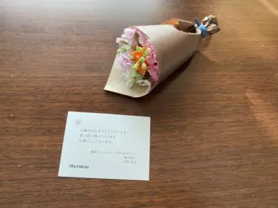 ホテルからのバースデーメッセージと手のひらサイズのミニミニブーケ。気取らないかわいらしいサイズで持ち帰りも簡単です。ホテルからのあたたかい心遣いがつまったすごく粋なプレゼントだと思いました。