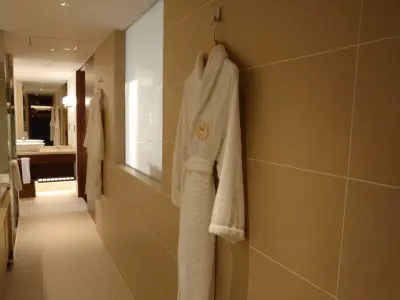 バスローブはまるでアートのように壁にかけてありました。お風呂上りにさっと羽織れる場所でもあるので便利です。